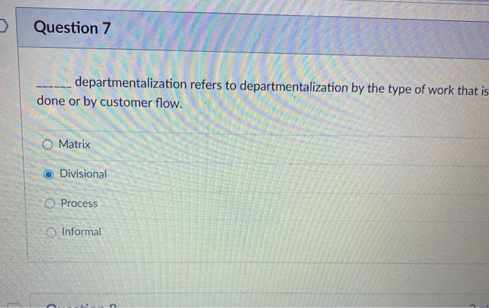 Solved Question 7 Departmentalization Refers To Chegg Com